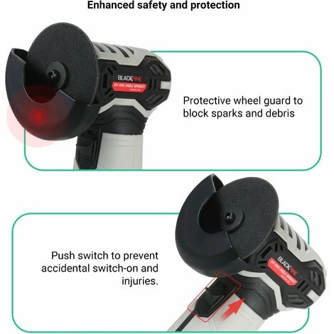 Erweitert Sicherheit und Schutz – Dieses Gerät ist außerdem mit einem Schutzradschutz ausgestattet, um Funken und Schmutz zu blockieren, und der Druckschalter wurde entwickelt, um versehentliches Starten und Verletzungen zu verhindern.